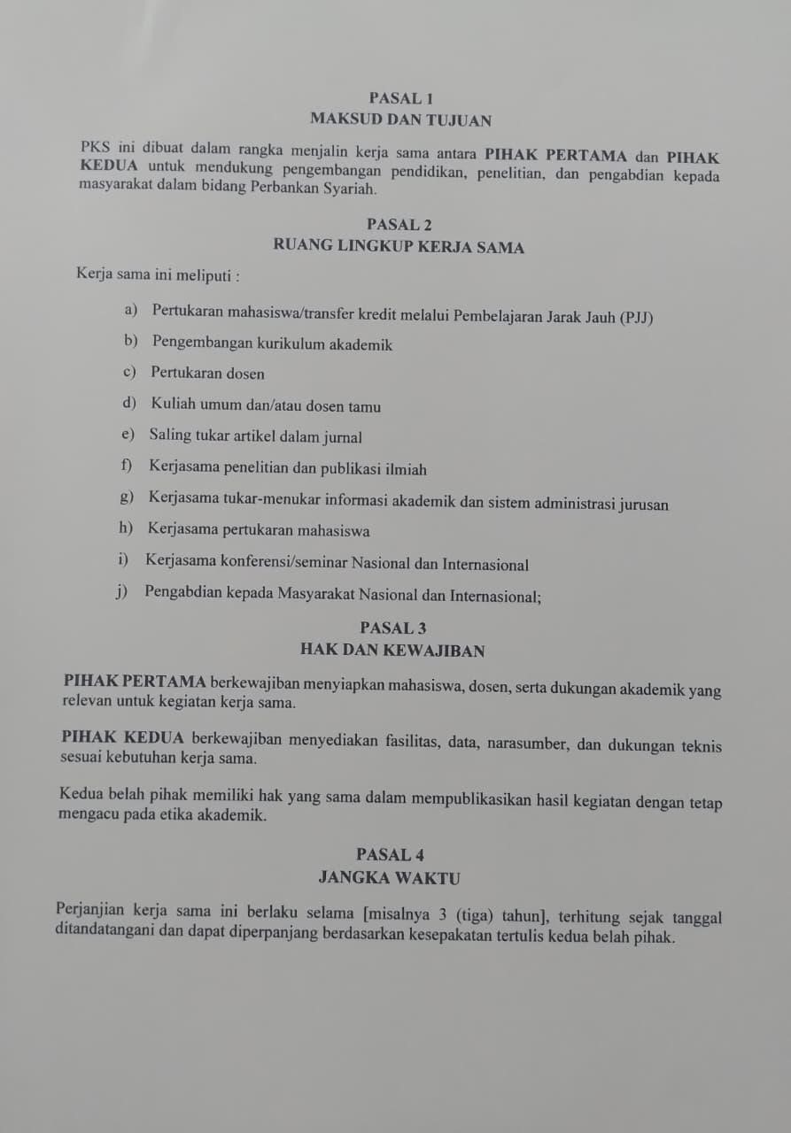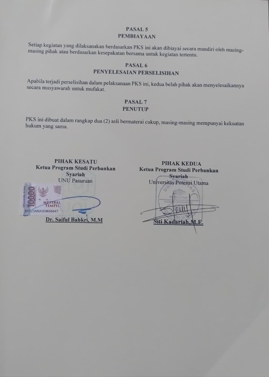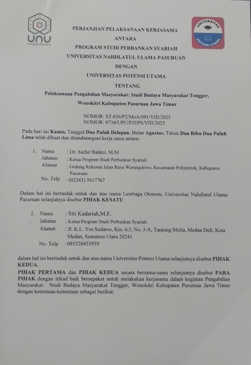 Pasuruan, 28 Agustus 2025. Program Studi Perbankan Syariah Universitas Potensi Utama (UPU) resmi melaksanakan Implementation Agreement (IA) bersama Program Studi Perbankan Syariah Universitas Nahdlatul Ulama (UNU) Pasuruan. Kegiatan ini dilaksanakan di Kampus Universitas Nahdlatul Ulama Pasuruan dan merupakan tindak lanjut dari Memorandum of Understanding (MoU) yang telah disepakati sebelumnya oleh kedua institusi.