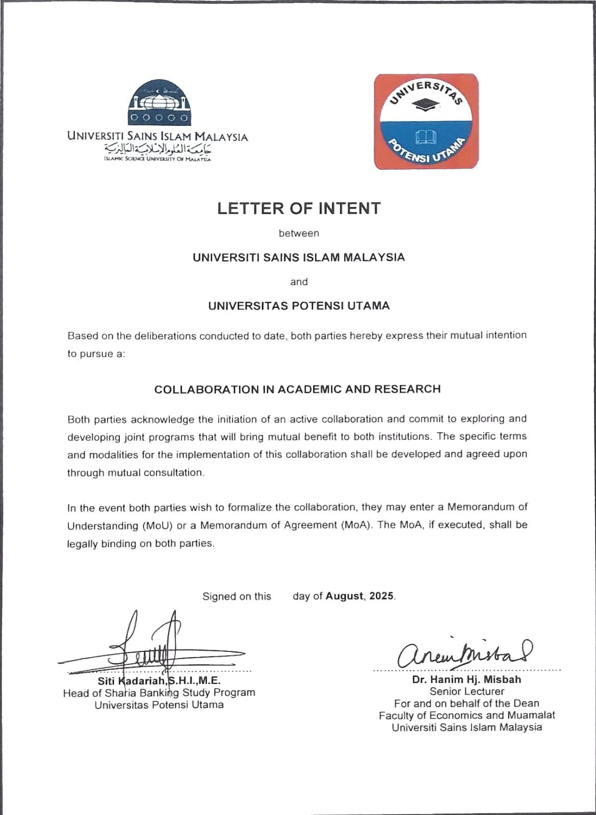 Medan, August 27, 2025. The Department of Sharia Banking, Universitas Potensi Utama (UPU), officially signed a Letter of Intent (LoI) with Welbeck and Bradwell, a professional consulting and advisory institution based in the United Kingdom. The signing marks the beginning of an international collaboration focusing on innovation in financial technology (FinTech) and the enhancement of digital financial literacy through consulting, training, and knowledge exchange.